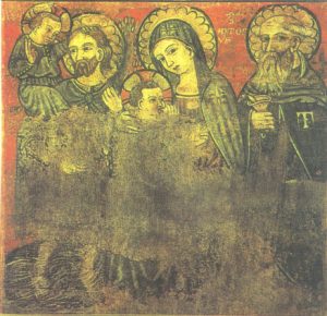 Pietro ubbidì e nel bagno le sue membra ripresero vigore e agilità. Recuperata così la salute, si ricordò delle promesse della Madonna. Frugò fra i sassi della fonte e, con non minore meraviglia scoprì il quadro, per niente rovinato dall’acqua termale, riproducente la Madre di Dio in atteggiamento squisitamente materno, con alla destra S. Cristoforo martire e alla sinistra S. Antonio Abate. Era il maggio del 1428.